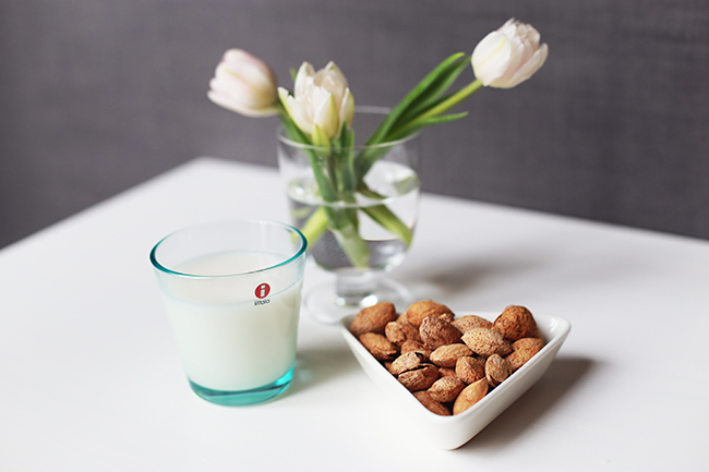 -Mleko migdałowe – w 100 g znajduje się około 24 kcal, 1,1 g tłuszczu, 3 g węglowodanów (3 g cukrów), 0,5 g białka, 0,2 g błonnika, 120 mg wapnia.