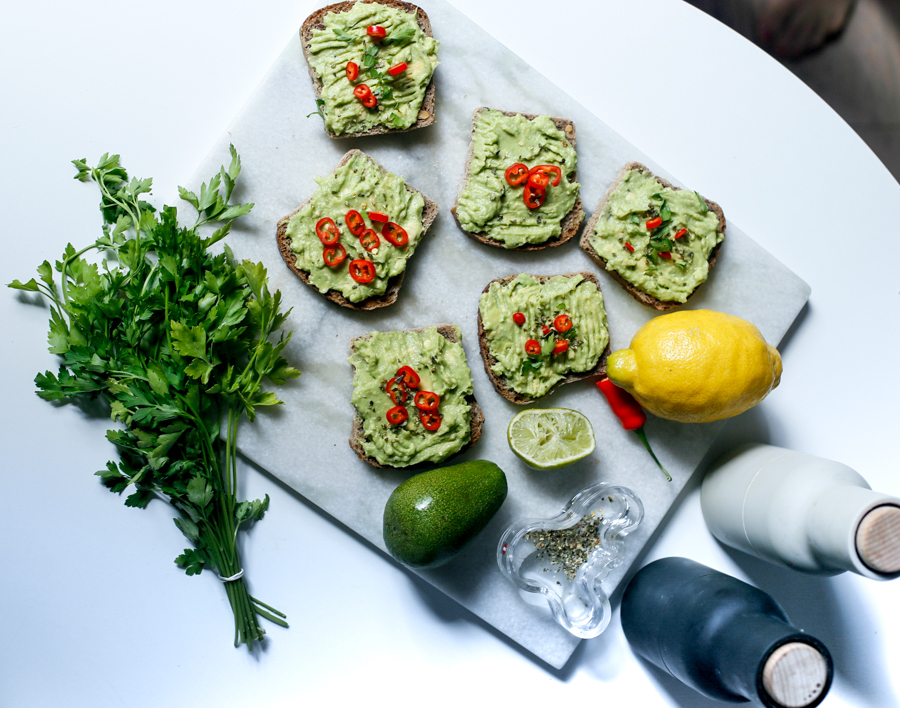 Awokado wydrąż łyżką, dodaj sok z limonki i przypraw do smaku, połacz składniki, rozgniatając je widelcem. Przełóż masę na kromki chleba pełnoziarnistego, posyp pokrojoną papryczką chilli i pietruszką.