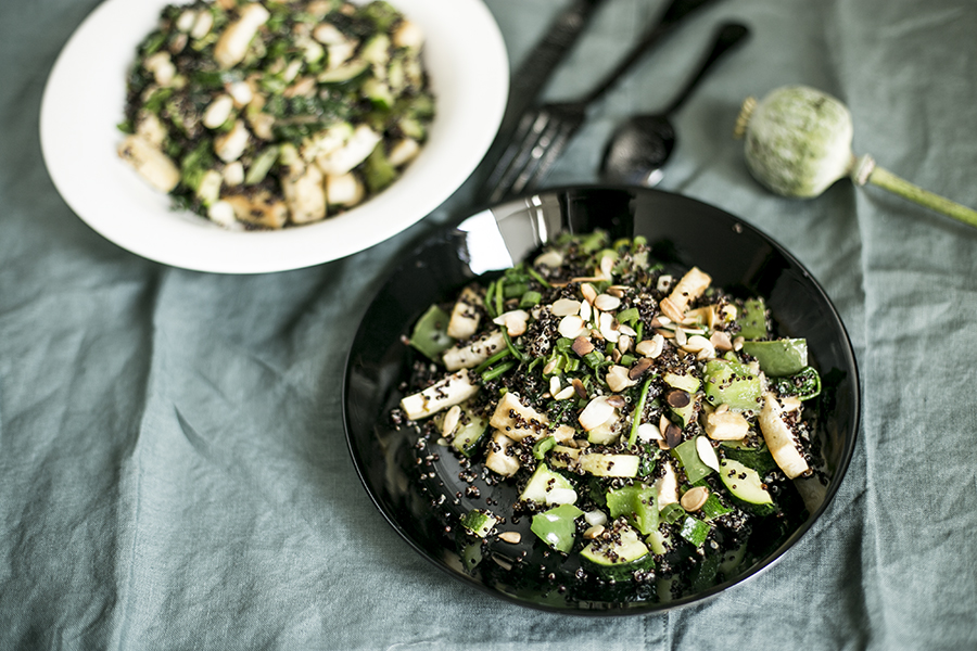 Canihua z zielonymi warzywami, tofu i sosem miso