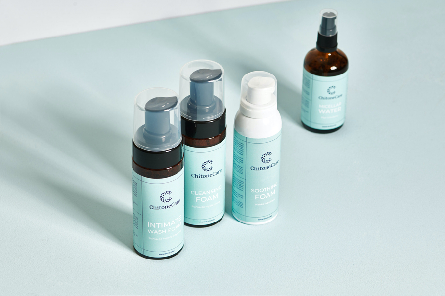 Żel pod prysznic, pianka oczyszczająca do twarzy czy płyn micelarny ChitoneCare zostały stworzone na bazie hydrożelu ChitoVelum®, którego głównym składnikiem jest chitozan wytwarzany z pancerzy skorupiaków, stanowiących niepotrzebną pozostałość w przemyśle spożywczym. W taki sposób połączono wyjątkowe właściwości hydrożelu z minimalną ilością innych składników, uzyskując w ten sposób innowacyjne kosmetyki o pielęgnacyjnych i nawilżających właściwościach przeznaczonych do najbardziej wymagających typów skóry.
