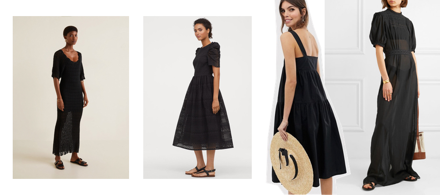Latem 2019 doskonale sprawdzą się bawełniane, lniane sukienki z kwadratowym dekoltem i bufkami. Są dekorowane guzikami, a „kropkę nad i” stanowią zmysłowe rozcięcia eksponujące nogi. Długie warianty nosimy z rzymskimi sandałami lub fasonami butów na geometrycznym obcasie, odmieniającymi charakter stylizacji w nieco bardziej awangardową. Kolejną odsłoną czarnych, popularnych sukienek, są projekty dekorowane haftami i ażurem, bądź dekoltem V i wycięciem typu pętelka. W rustykalnym klimacie, świetnie współgrają ze słomianymi kapeluszami czy wiklinowymi torebkami.