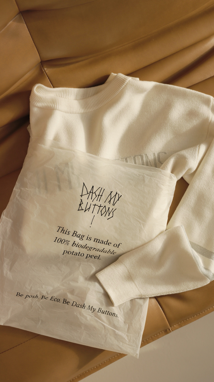 We własnych kreacjach Dash My Buttons stosują alternatywne podejście do produkcji, wykorzystują szereg zrównoważonych tkanin, w tym TENCEL® i LYOCELL®, które są produkowane z celulozy drzewnej, a dokładnie z drewna eukaliptusowego. Marka używa również len, a także bawełnę organiczną, wełnę merynosa i włóknistych materiałów roślinnych. Ponadto producent sięga po zrównoważone środki do wysyłki i pakowania, takie jak 100% biodegradowalne torebki ze skórki ziemniaków.
