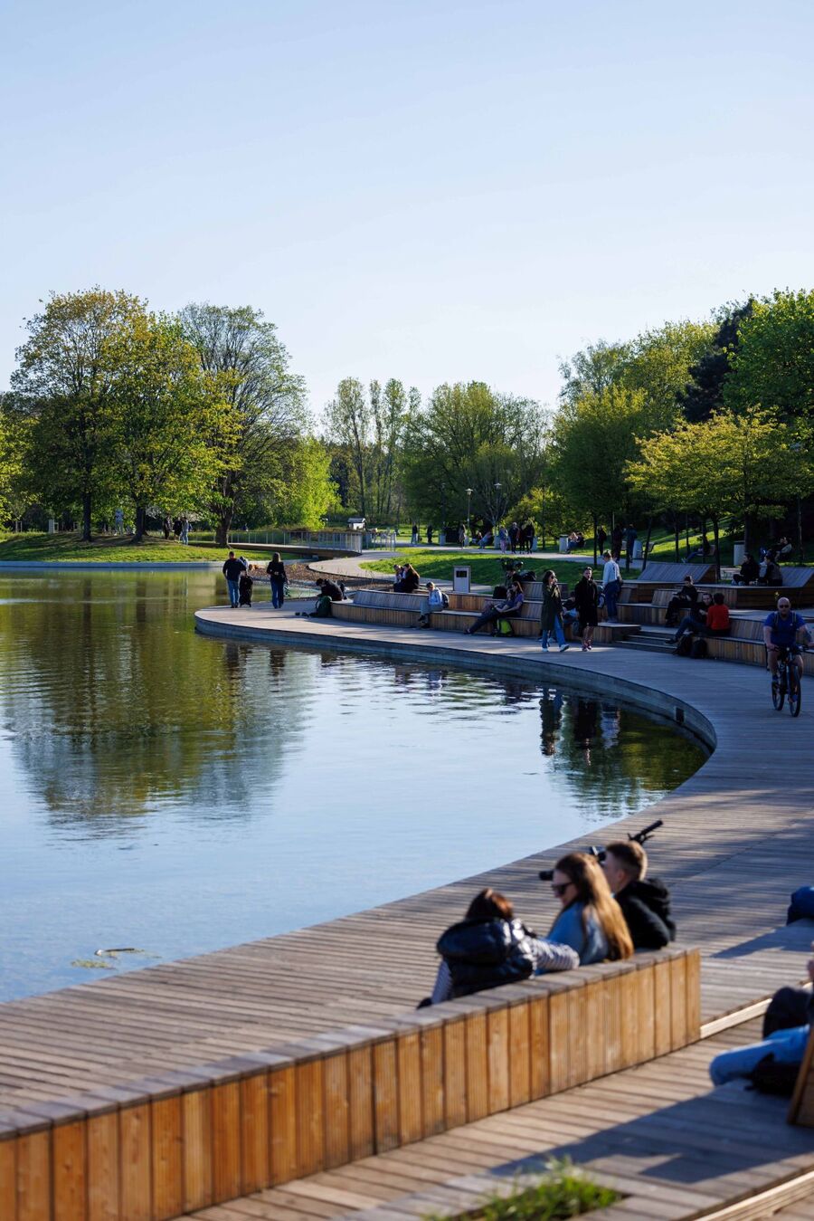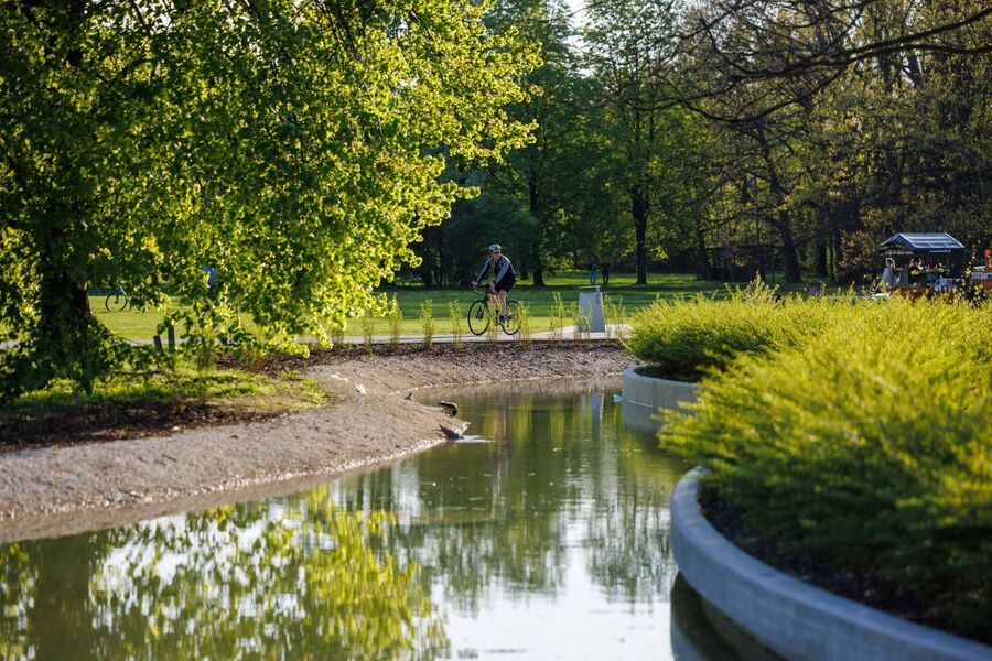 Modernizacji poddano także teren wokół znaturalizowanego systemu wodnego. Uzupełniona została sieć ścieżek, a ich nawierzchnię wymieniono na przepuszczalną. Nad samym zbiornikiem głównym zaprojektowano nowy mebel miejski – drewniany dek o tarasowym układzie uzupełniony drewnianymi mostkami oraz małą architekturą dla różnych form wypoczynku, m.in. z miejscami do siedzenia, platformami do leżenia czy stołami piknikowymi. W północnej części zbiornika, pomyślanej jako strefa rekreacyjna, na trzech różnych wysokościach zaprojektowano siedziska, które tworzą widownię skierowaną w stronę jeziora. Jako osobną przestrzeń w części południowej zbiornika wydzielono strefę regeneracyjną – bardziej naturalną i dziką, zarezerwowaną dla roślin i zwierząt.