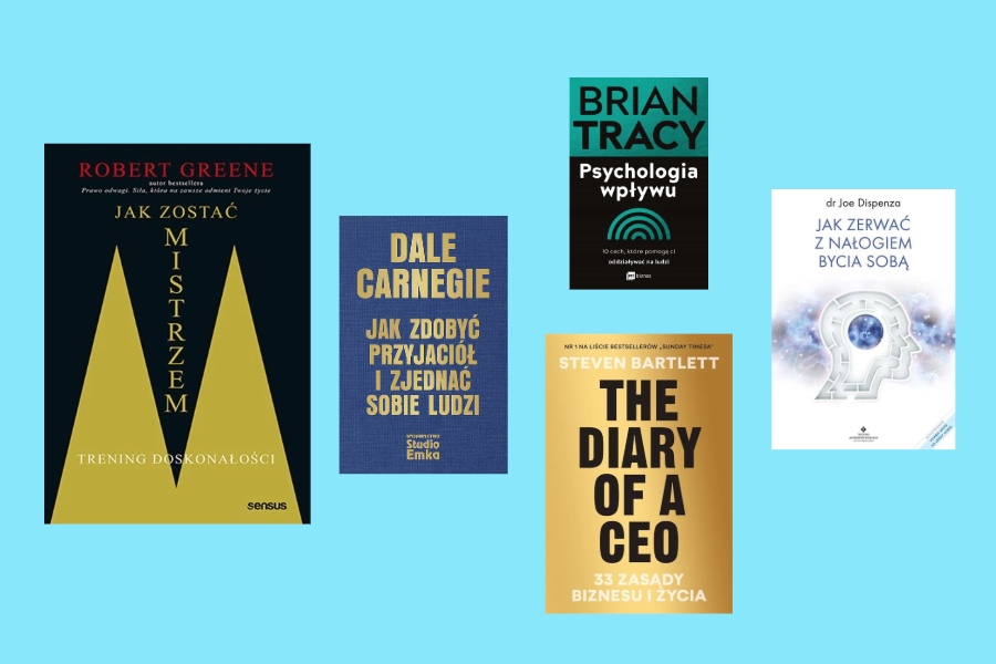 Najlepsze książki rozwojowe, które musisz przeczytać – 5 ponadczasowych tytułów zmieniających myślenie: Jak zostać mistrzem. Trening doskonałości – Robert Greene; Jak zdobyć przyjaciół i zjednać sobie ludzi – Carnegie Dale; Psychologia wpływu. 10 cech skutecznych ludzi – Tracy Brian; The Diary of a CEO. 33 zasady biznesu i życia – Steven Bartlett; Jak zerwać z nałogiem bycia sobą – Dispenza Joe.