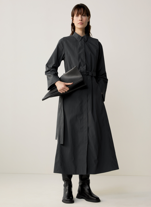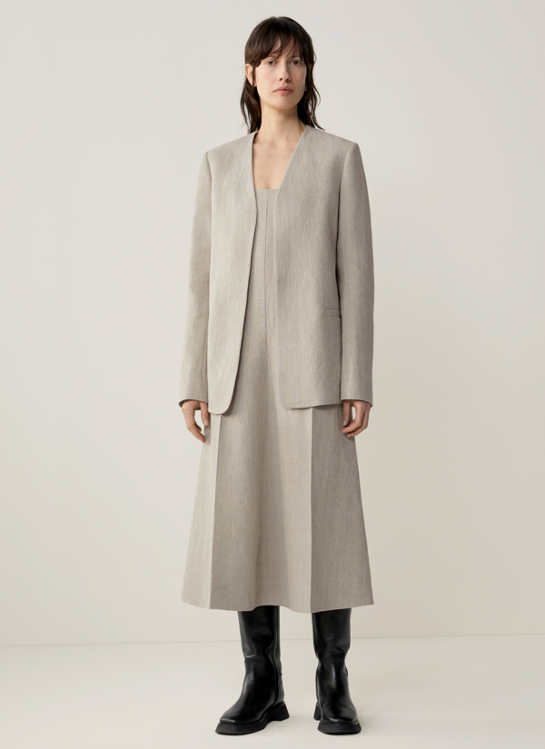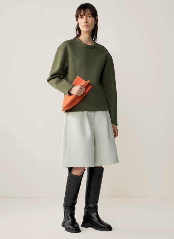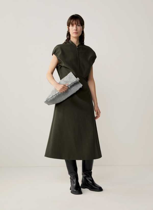 Jak powstaje ekologiczna moda? Odpowiedzialne pozyskiwanie tkanin przez COS w trosce o Planetę powoduje, że z plastiku powstaje nylonowa tkanina, a z butelek i sieci rybackich – gładka przędza łączoną z surowym lnem i włóknami organicznego papieru. A wszystko to w neutralnych odcieniach beżu czy szarości, gdzieniegdzie przebija się jednak błękit, wiesiołkowy róż, ciepły oranż czy sosnowa zieleń. Marka, która odznacza się prostotą, ale przede wszystkim charakterystycznymi, nieoczywistymi konstrukcjami w sezonie jesień – zima postawiła na klasyczne garnitury w połączeniu z lejącymi draperiami spódnic, a dekolty i linie ramion ulegają zaś asymetrycznym przeobrażeniom. Te konstrukcje, stworzone na bazie tkanin o bogatych teksturach wspólnie z tkaninami o bogatych teksturach tworzą zupełnie nowe, zaskakujące formy. Obok naturalnych odcieni i klasycznych krojów, techniczną, nowoczesną stronę kolekcji odzwierciedla czuły na temperaturę materiał, który pod wpływem niskiej temperatury ujawnia abstrakcyjny wzór.