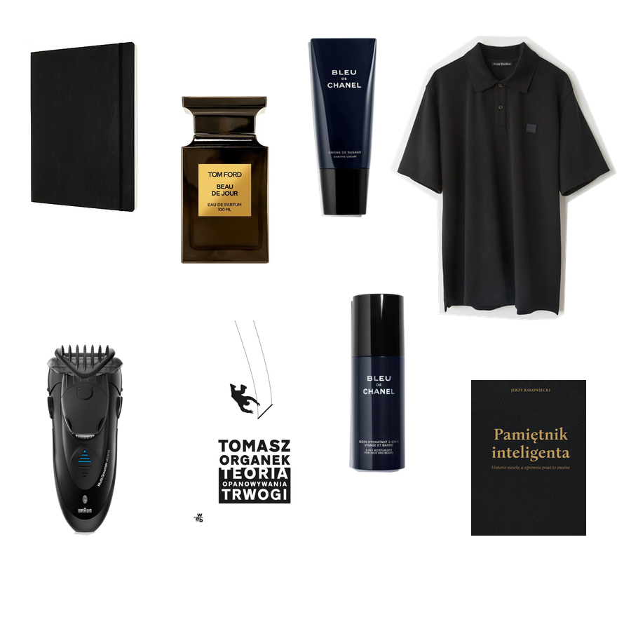 Dzień Ojca 2019: Moleskine notes, TOM FORD zapach Beau de Jour, BLEU DE CHANEL krem do golenia, Acne Studios polo, BRAUN wielofunkcyjna maszynka do ciała MG50, Tomasz Organek „Teoria opanowywania trwogi”, BLEU DE CHANEL nawilżający krem 2w1, Rakowiecki Jerzy „Pamiętnik inteligenta” .