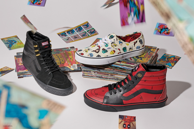 Czarna Pantera, Hulk i Spider-Man zostali ukazani ponownie w specjalnie dedykowanej dla nich kolekcji kapsułowej. Stylizowany za pomocą wytrzymałego ripstopu, przypominających szpony elementów i wytłaczanych wzorów, model Sk8-Hi Czarna Pantera nawiązuje do kostiumu króla T’Challi, który wykonany był z vibranium. Czarna Pantera pojawia się również na koszulce z krótkim rękawem i kurtce Torrey łącząc klasyczny komiks z grafikami Vans w stylu vintage. Model Slip-On prezentuje niesamowitą siłę Hulka, z jego stopami przedzierającymi się przez wzór szachownicy.Fani Hulka mogą cieszyć się możliwością zbudowania niesamowitego total look’u, gdyż kolekcja zawiera dedykowaną postaci czapkę, koszulkę i skarpetki, natomiast wizerunek She Hulk debiutuje na koszulce z krótkim rękawem. Nadludzkie zdolności Spider-Mana są ukazane na całej powierzchni klasycznego modelu Slip-On i klapkach, podczas gdy motywy pajęczej sieci i barwy superbohatera pojawiają się w linii męskiej, damskiej i dziecięcej oraz na akcesoriach.Venom, jako uosobienie złych mocy, kontruje jaskrawym barwom Spider-Mana a dedykowane mu ubrania łatwo rozpoznać po małych, ale złowrogo wyglądających elementach, które przedstawiają groźny uśmiech Super Łajdaka. Deadpool zaskakuje specjalną kolorystyką modelu Sk8-Hi. Detale na wytrzymałej czarno-czerwonej skórze inspirowane są zbroją Deadpoola, w którą wbudowana jest broń taka jak miecze czy gwiazdy ninja, zapewniające dodatkową ochronę przed wrogami.