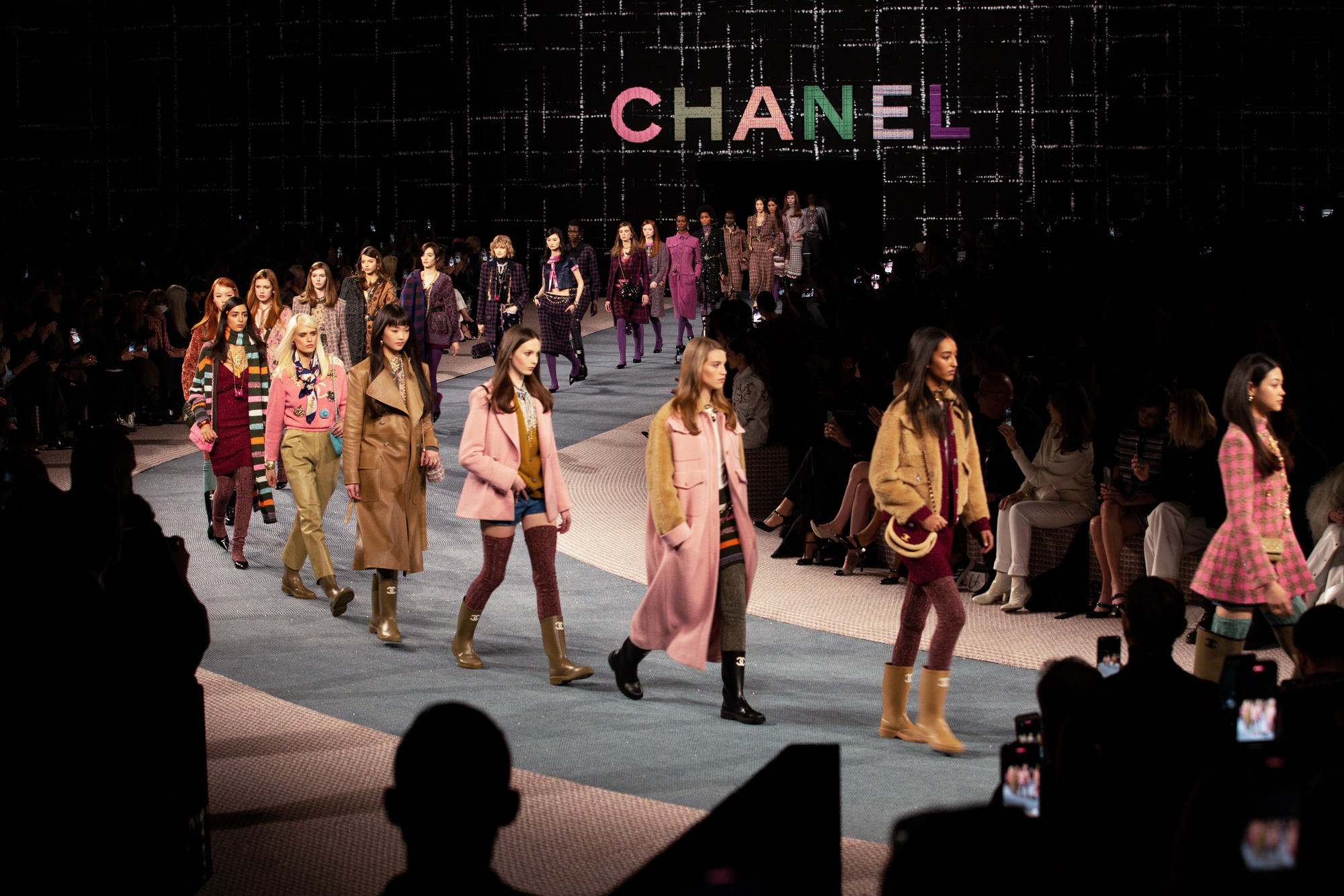 Cała kolekcja została szczególnie poświęcona tweedowi. Tweed to materiał szlachetny i jedyny w swoim rodzaju: pozwala bowiem na nieskończone kombinacje kolorów i materiałów, jednocześnie stanowiąc symbol francuskiego domu mody, bez którego Chanel nie istnieje. Virginie Viard podążając śladami Gabrielle Chanel wzdłuż rzeki Tweed, która niegdyś podczas spacerów po szkockiej wsi zbierała paprocie i bukiety kwiatów, aby zainspirować lokalnych rzemieślników do pożądanych odcieni, wyobraziła sobie teraz tweedy w kolorach tego krajobrazu, co idealnie odzwierciedla chociażby długi różowy płaszcz subtelnie nakrapiany błękitem i fioletem, albo burgundowy garnitur z delikatnym złotym połyskiem. Inspiracją dla Virginie była także Anglia w latach 60. i bardzo kolorowe wówczas okładki płyt. Szczególnie jednak, przy tworzeniu najnowszej kolekcji, projektantka swą uwagę skupiła na stylizacji Gabrielle zapożyczonej od kochanka – księcia Westminsteru, która na zdjęciach zrobionych w jego domku w Lochmore na tarasie jego wiejskiego domu w Eaton Hall ma na sobie pożyczone ubrania i kalosze. Projektantka przywołała ducha tego weekendowego wypadu dzięki kolorowym rajstopom w grube prążki i gumowym kaloszom. Czy może być bowiem coś bardziej seksownego, niż noszenie ubrań osoby, którą kochamy?